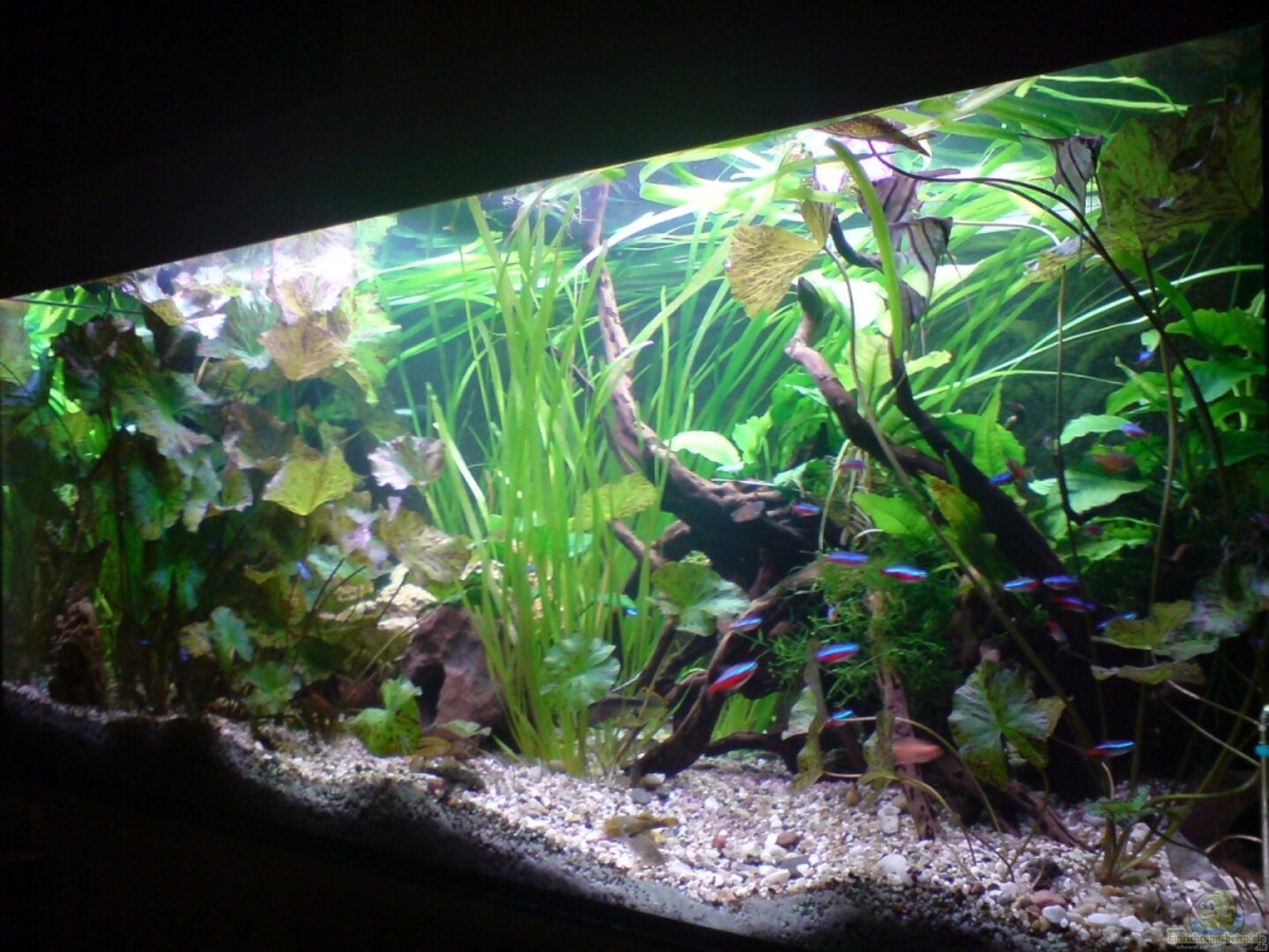 Aquarium Rückwand: Bestehend aus Kork und mit einem dunklen Braunton (Erdfarben) bestrichen. Diese dann im Abstand zum Aquarium von 5cm dahinter angebracht. Das hat einen bestechenden Tiefen Effekt zur Folge.