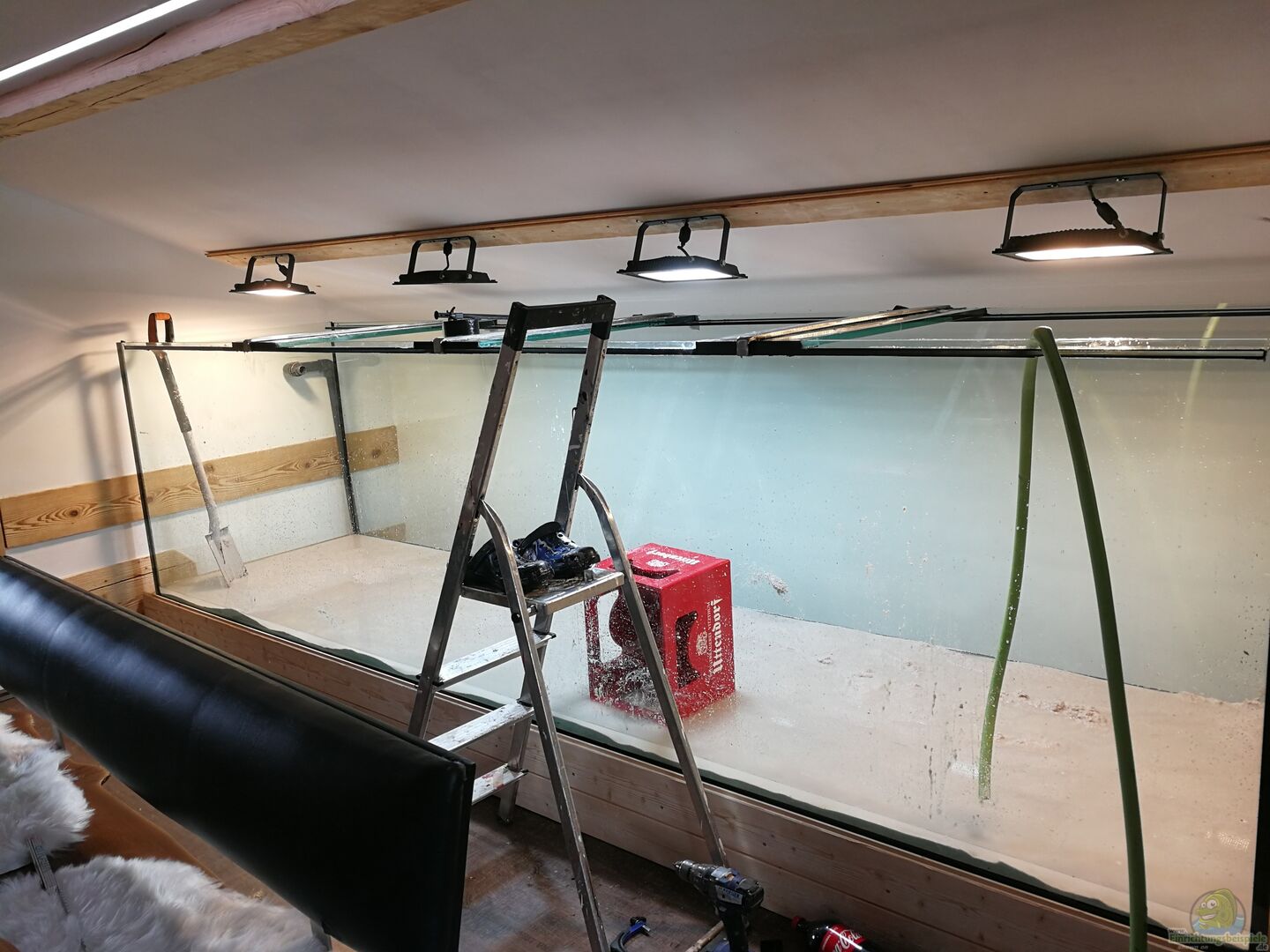 19mm Glas wurde selbst geklebt und gebaut. mit Handy steuerbar (wasserwechsel, Temperatur, Licht, Pumpe) steht im ersten Stock und wird mit U Träger gestützt die in der mauer geankert sind.Der Unterbau ist mit einer einstellbaren Eiesenkonstruktion gemacht wo eine 3 cm Holzpatte drauf liegt.Das aquarium ist nach oben hin offen, wegen den Wasserdampf und der Feuchtigkeit ist jedoch der obere Bereich bis zur Decke dampfdicht verbaut.