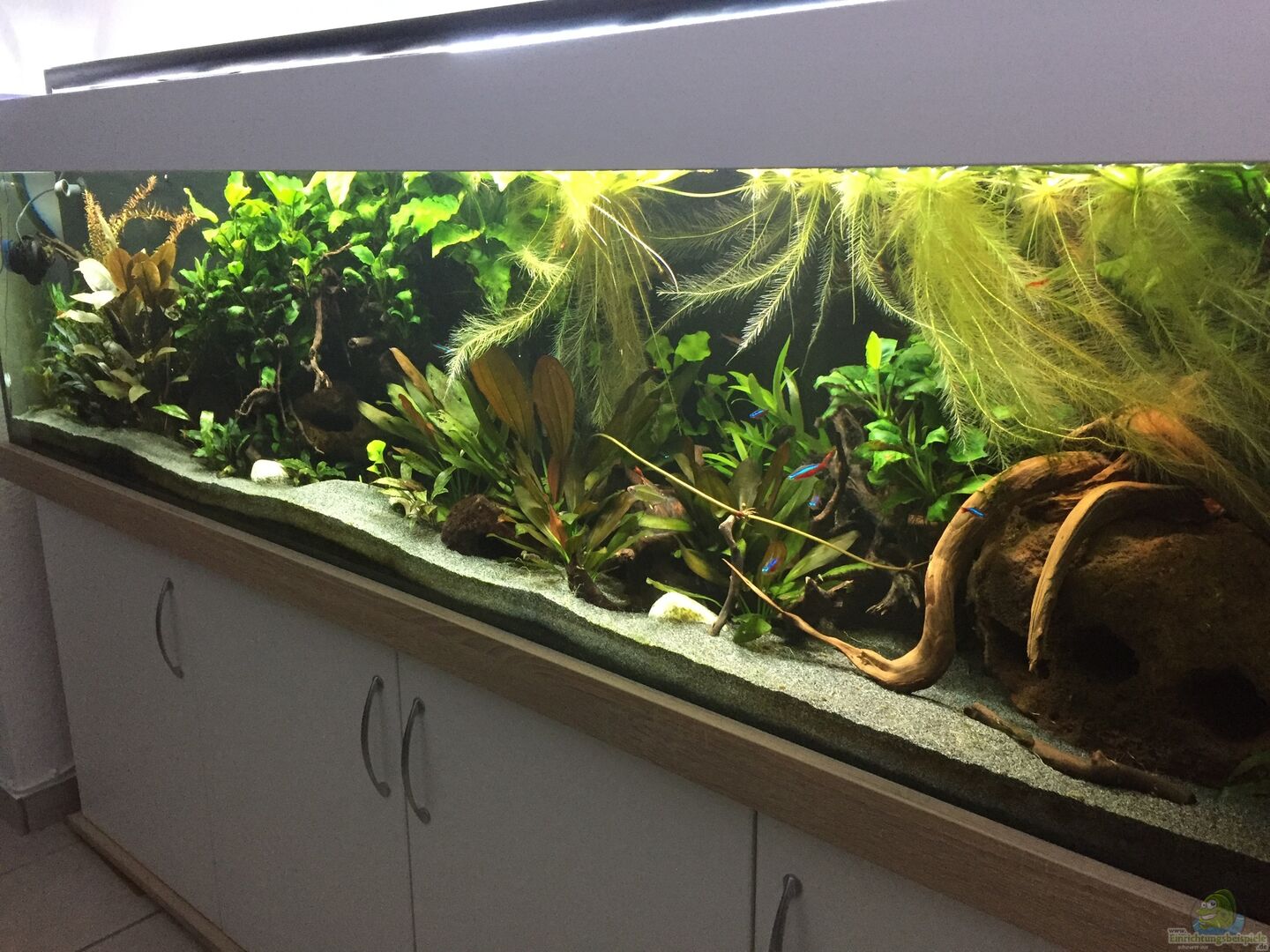 Es handelt sich um ein Standartaquarium mit einem 4-Kammer-Innenfilter im linken hinteren Eck. Das Aquarium ist mit Plexiglasscheiben abgedeckt.