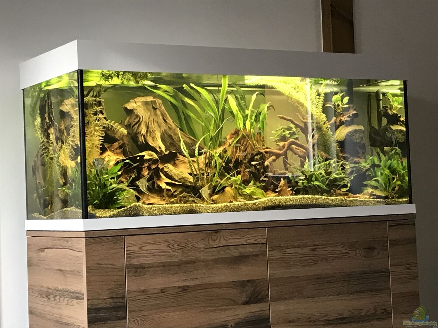 Das Becken ist aus 12 Millimeter starkem Floatglas gebaut. Das Glas wurde mit schwarzen Silikon durch Wulstverklebung verklebt. Au??erdem sind drei Bodenbohrungen rechts für Filteranschluss (Eheim 2180) vorhanden. Der Unterschrank ist mit dicken Aluprofilen verstärkt und sehr massiv. Das Holzfurnier wurde passend zum Fu??boden ausgewählt. Die komplett wei??e Abdeckung dichtet das Becken gänzlich ab, so dass ich kaum Wasserverdunstung habe. Die Deckel sind frei einteilbar und ich bin sehr flexibel [...]