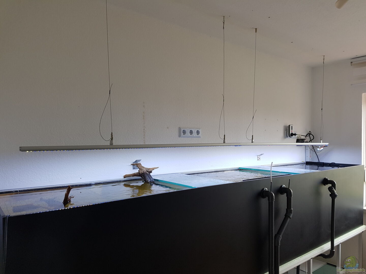 Standard rechteck Becken was vor Ort verklebt wurde. Die Ablauf und Zulauf Bohrungen wurden in die Rückwand gebohrt. Der Ablauf ist eine selbst gebaute OverflowBox aus PVC. Frontscheibe aus weissglas.