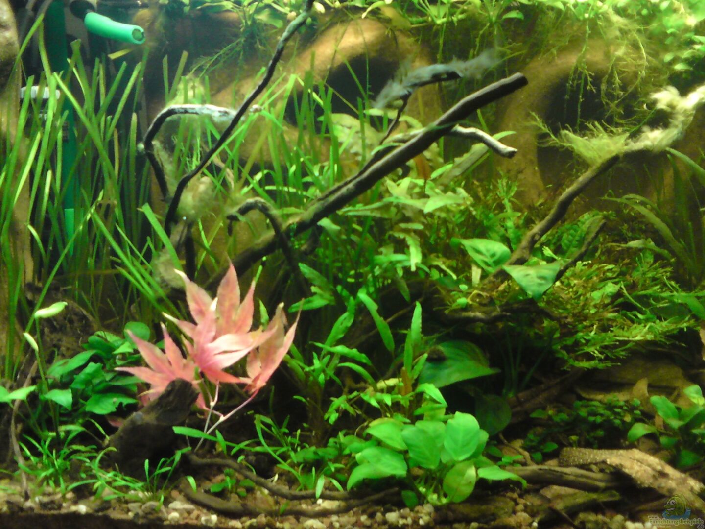 Eigenbaurückwand aus Styropor, Portlandzement und Epoxidharz. Moorkienwurzel und Pflanzentaschen eingearbeitet, eingefärbt und mit Flu??sand abgestreut. Fassungsvermögen: ca. 150 Liter netto. Eigenbau Unterschrank "Buche" von unseren Schreinerlehrlingen.