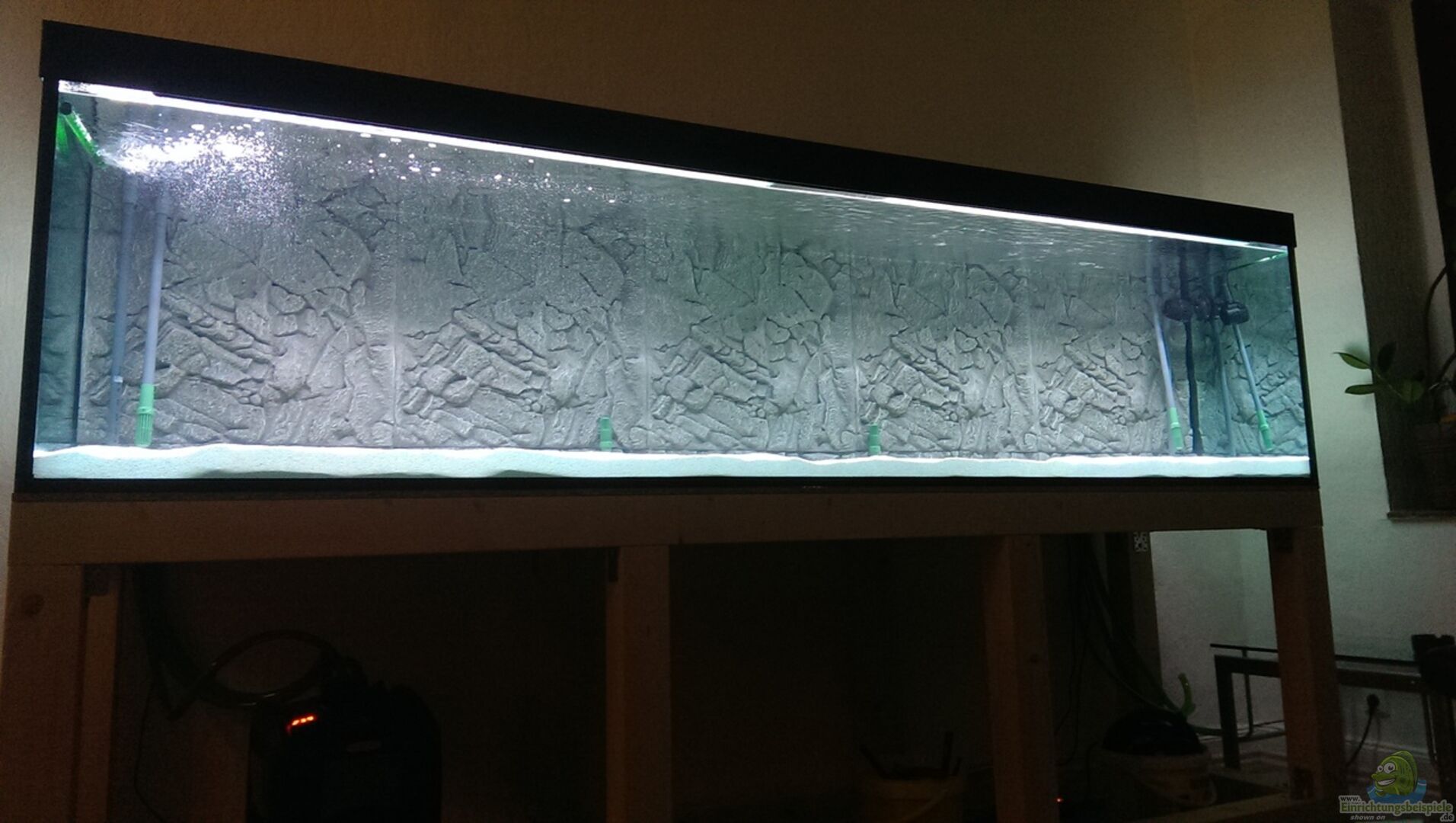 Becken wurde Zuhause geklebt und steht auf einem selbstgebauten Gestell aus KVH in 10cm x 10cm Balkenstärke. Die Juwel Rückwandsegmente sind fest verklebt. Technik wurde von mir nahezu nicht sichtbar installiert.