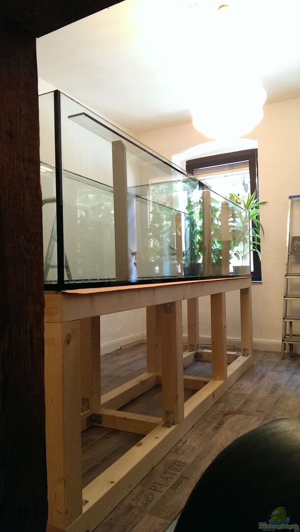 Becken wurde Zuhause geklebt und steht auf einem selbstgebauten Gestell aus KVH in 10cm x 10cm Balkenstärke. Die Juwel Rückwandsegmente sind fest verklebt. Technik wurde von mir nahezu nicht sichtbar installiert.