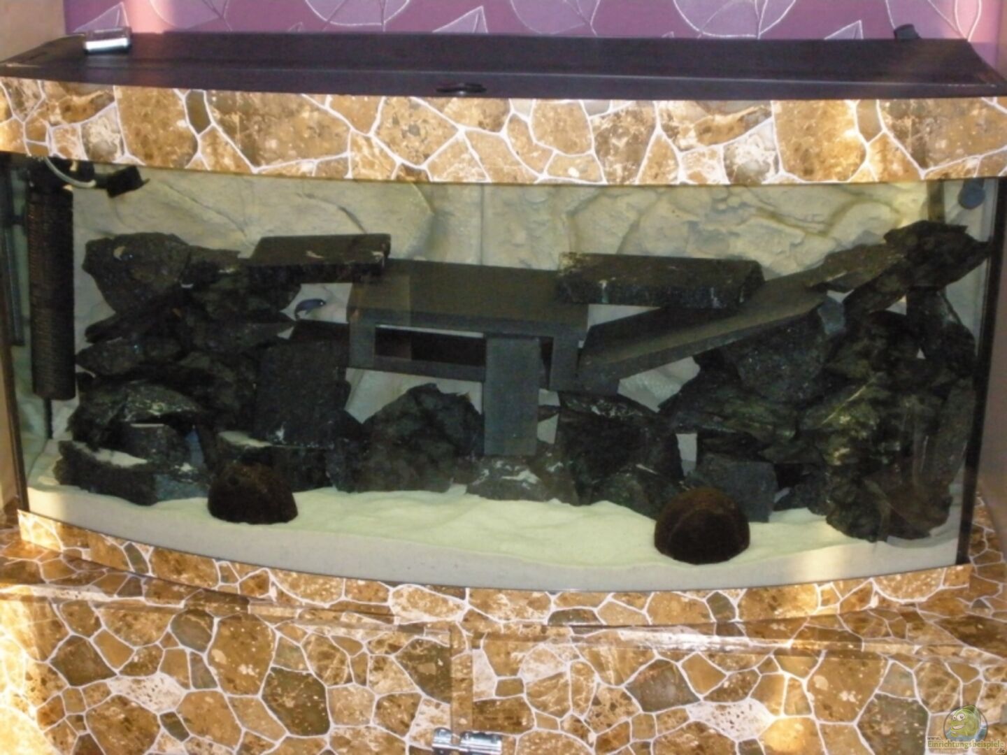 Juwel 260 Panoramabecken, 2 cm Styroporplatte auf Grund, Unterschrank ist eine Eigenkonstruktion aus OSB-Platten und Kanthölzern.