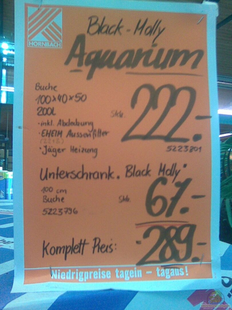 Hornbachset: MP Black Molly 100 - Becken 100/40/50 - Abdeckung in Buchenoptik - T8 Leuchtbalken (2 x 30W Daylight) - EHEIM Aussenfilter 2213 (Nicht im Einsatz!) - Jäger Heizstab 150W - diverses Kleinzeug. Nachdem für mich fest stand, dass ein neues Aquarium her muss, begab ich mich auf die Suche nach einem ´vernünftigen Becken und einer schönen Abdeckung. Ich habe dazu die Preislisten aller namhaften Hersteller gewälzt und etliche Online-Shops durchsucht. Auch mit Preis-Maschinen [...]
