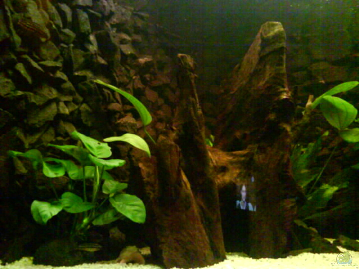 Das Becken ist mit Styropor auf der Rückwand verklebt. Darauf wurde Bruchstein mit Silikon ebenfalls verklebt. Und ehrlich gesagt, das war eine sch.... Arbeit. Das Filtersystem ist im hinteren Teil des Aquariums installiert worden ( hinter einer schrägen Styroporplatte ). Der Arbeitsaufwand war enorm, da jeder Stein einzeln geklebt ist.