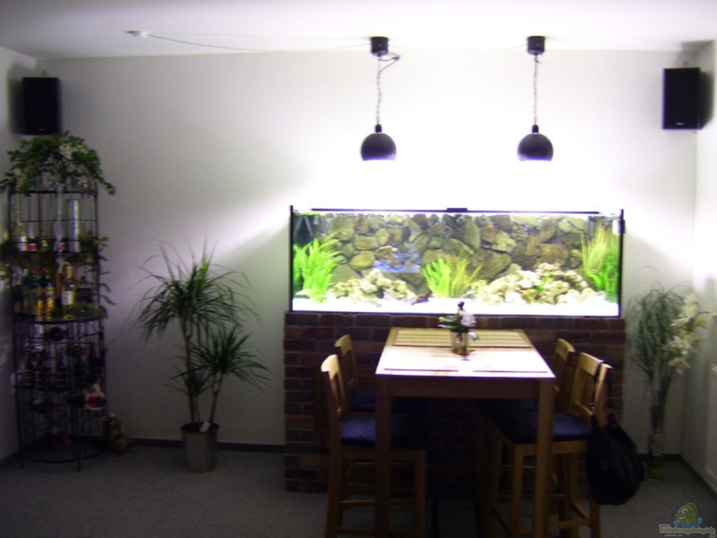 Rückwand aus flachen Schiefersteinen, die an einem See gesammelt wurden. Beim Bau der rückwand wurde darauf geachtet, dass keine scharfen Kanten an den Steinen vorhanden sind. In der Rückwand befinden sich zusätzliche Höhlen in verschiedenen Grö??en, die den Barschen und insbesondere den Welsen weitere Rückzugsmöglichkeiten bieten. Unterbau aus Ytong-Steinen mit Riemchen verkleidet und verfugt. Gesamte Technik im Unterbau.