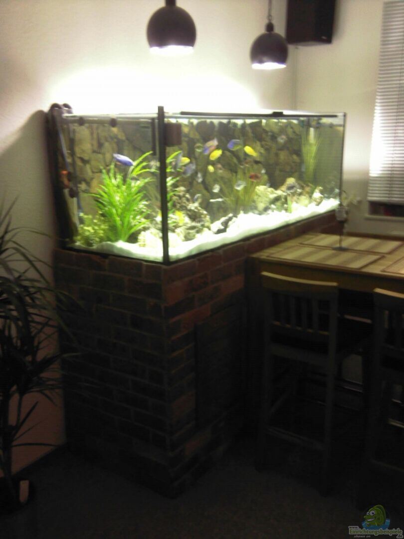 Rückwand aus flachen Schiefersteinen, die an einem See gesammelt wurden. Beim Bau der rückwand wurde darauf geachtet, dass keine scharfen Kanten an den Steinen vorhanden sind. In der Rückwand befinden sich zusätzliche Höhlen in verschiedenen Grö??en, die den Barschen und insbesondere den Welsen weitere Rückzugsmöglichkeiten bieten. Unterbau aus Ytong-Steinen mit Riemchen verkleidet und verfugt. Gesamte Technik im Unterbau.