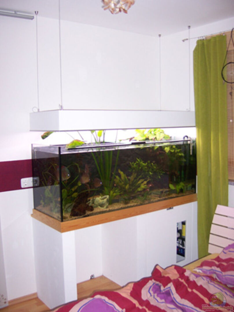 Das Aquarium steht auf einer Eigenbau-Unterkonstruktion, die aus einer Dreischichtplatte und Ytongsteinen besteht. Die abgehängte Lampenabdeckung ist ebenfalls sellbstgebaut sowie die Tür zu der Technik.