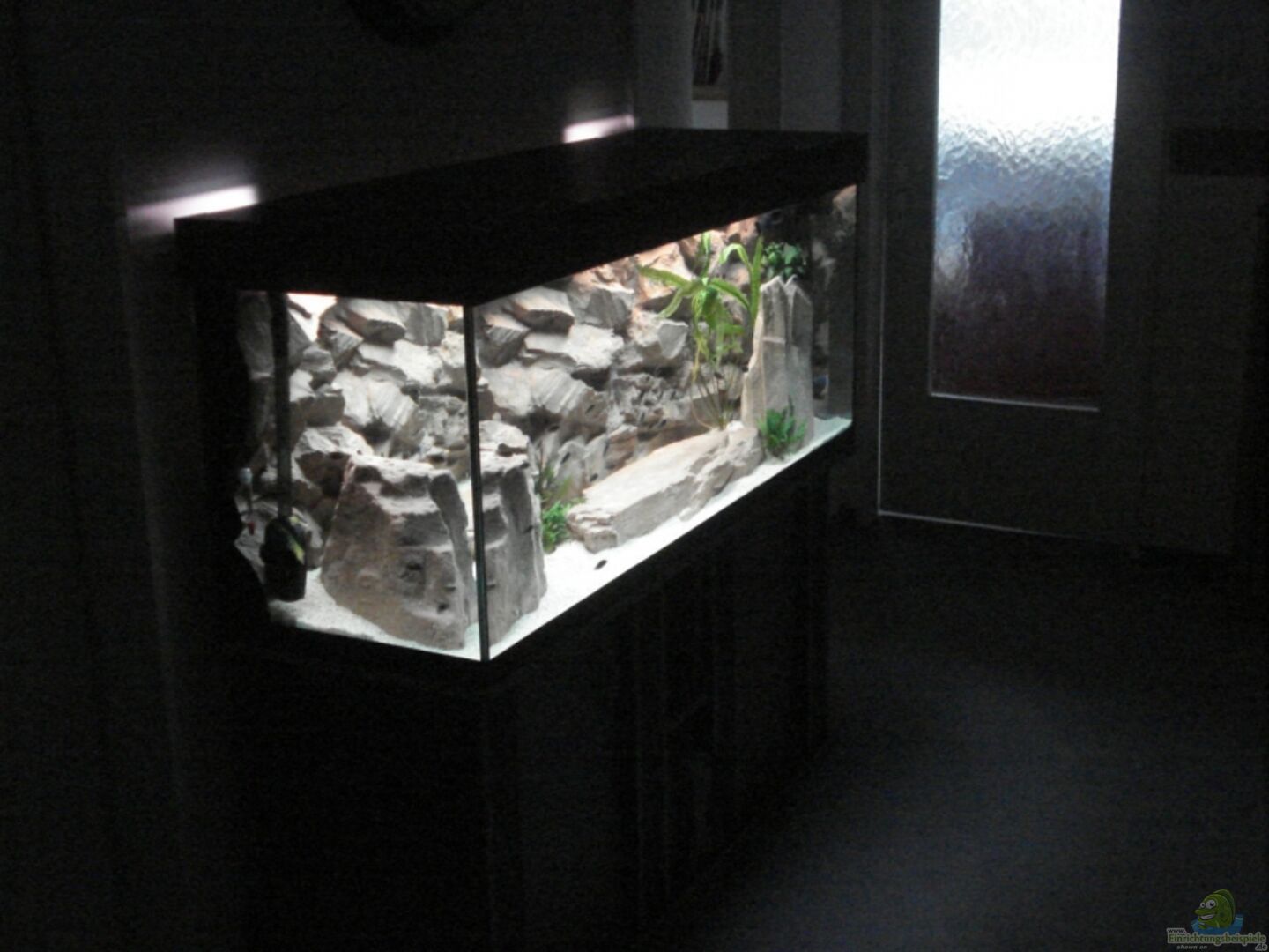 12 mm Glas stossverklebt vom örtlichen Aquarienbauer hergestellt mit passendem Unterschrank und Abdeckung in Nussbrauner Optik Als Kiesblende verwende ich eine schwarze selbstklebende Folie aus dem Baumarkt. Das Becken liegt auf einer Aquariumschaumgummimatte von JBL zum Ausgleich von Unebenheiten, ca.5 mm dick.