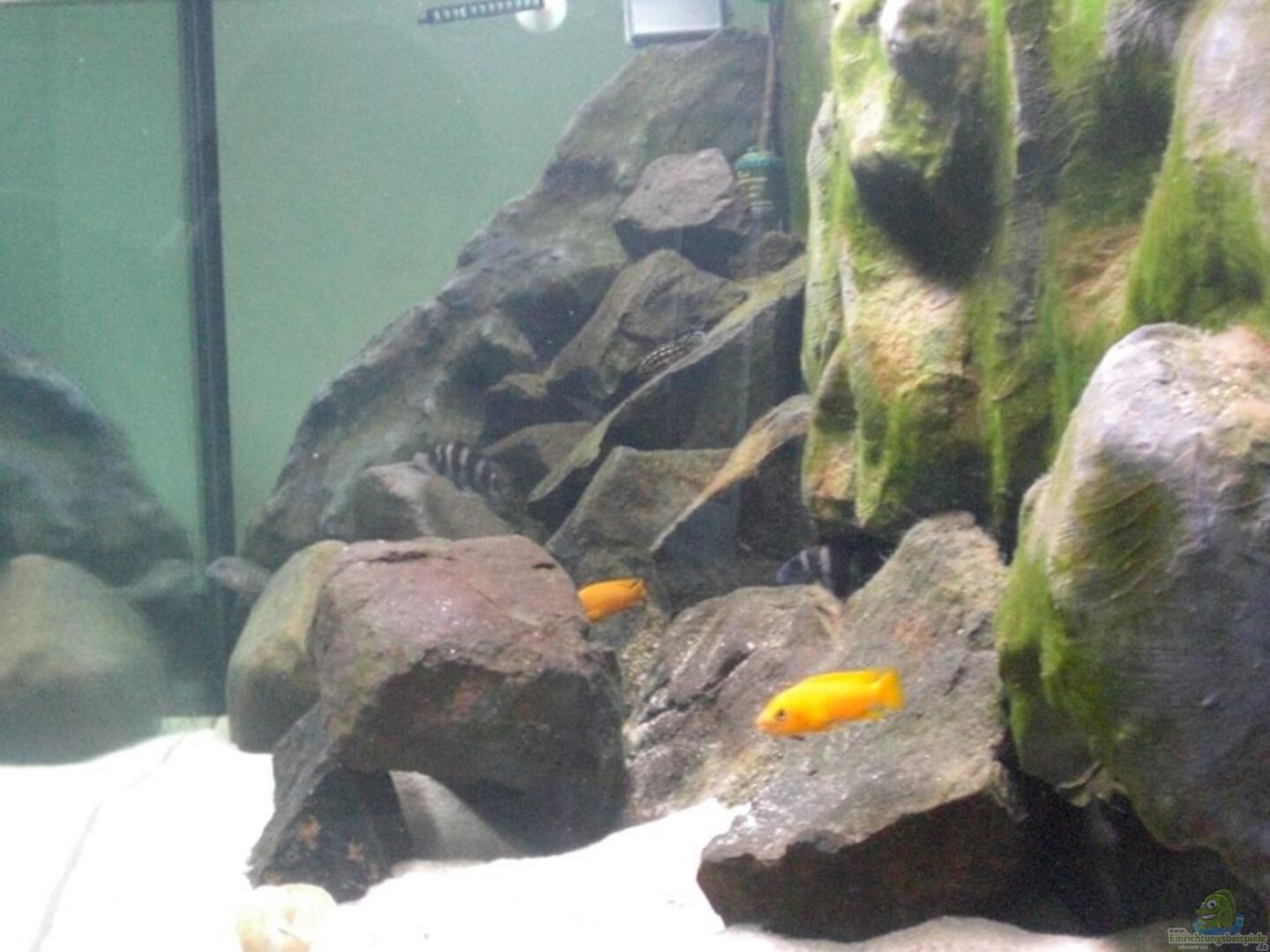 Selbst gebaute Rück und Seitenwand aus Styropor und eingefärbtem Zement mit integrierten Höhlen. Auslass und Ansaugvorrichtung sind kaum noch sichtbar