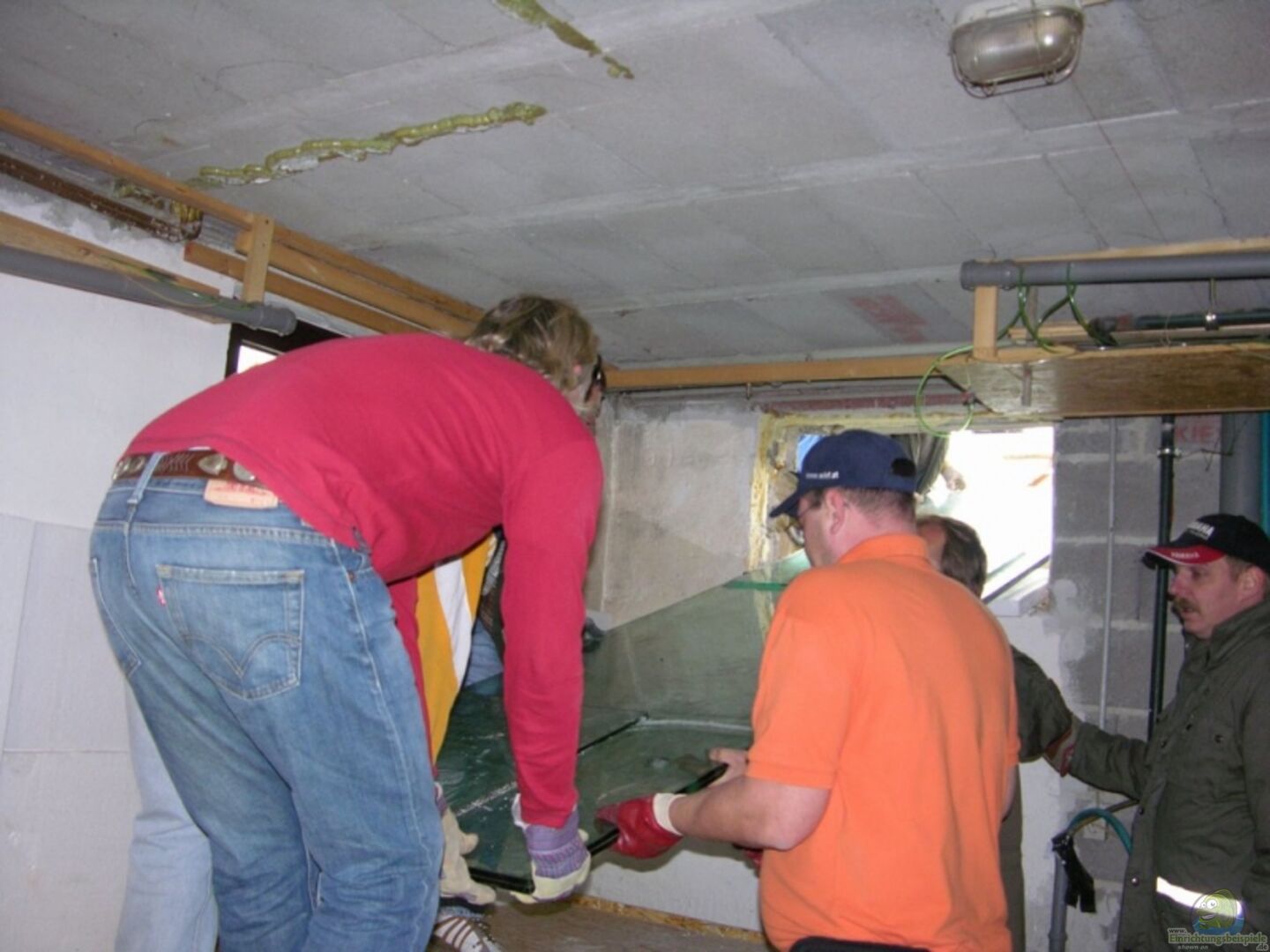Durchlaufaquarium mit Ablauf ins grosse Becken. Gebraucht gekauft, mit Freunden vom fischliforum abgebaut. Das Kellerfenster (wieder mal) rausgestemmt, in den Keller geschafft und dann mit Ruhe wieder aufgebaut. Die Frontscheibe wurde erst nach fertigstellung der Rückwand und Deckendekoration eingeklebt. Glasstärke 2x12mm VSG, Alle Klebefugen wurden zusätzlich mit 15mm 7cm breiten Glasstreifen verstärkt sodass sich eine 4cm Silikonnakt ergibt, das reine Glasgewicht ist ca 1000kg. Unterbau [...]