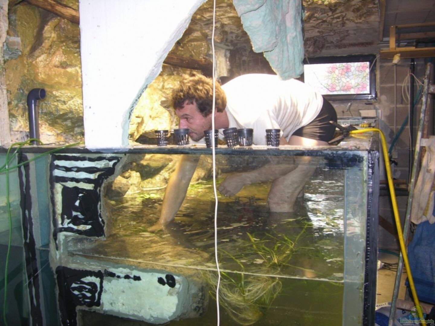 Durchlaufaquarium mit Ablauf ins grosse Becken. Gebraucht gekauft, mit Freunden vom fischliforum abgebaut. Das Kellerfenster (wieder mal) rausgestemmt, in den Keller geschafft und dann mit Ruhe wieder aufgebaut. Die Frontscheibe wurde erst nach fertigstellung der Rückwand und Deckendekoration eingeklebt. Glasstärke 2x12mm VSG, Alle Klebefugen wurden zusätzlich mit 15mm 7cm breiten Glasstreifen verstärkt sodass sich eine 4cm Silikonnakt ergibt, das reine Glasgewicht ist ca 1000kg. Unterbau [...]