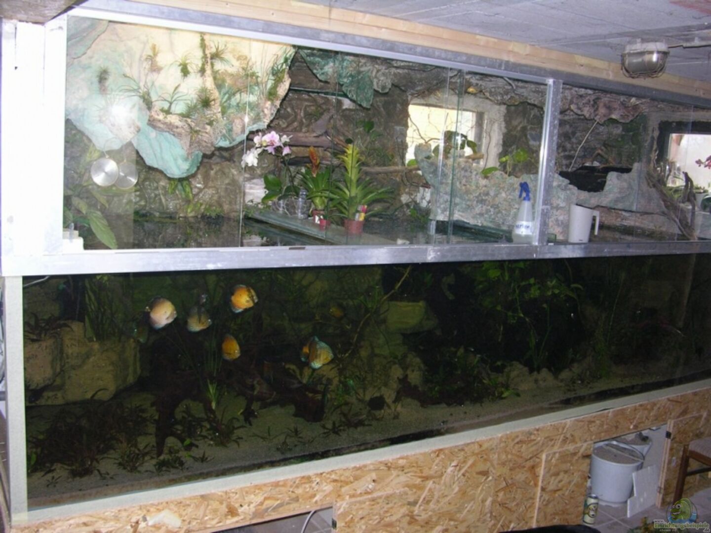 Durchlaufaquarium mit Ablauf ins grosse Becken. Gebraucht gekauft, mit Freunden vom fischliforum abgebaut. Das Kellerfenster (wieder mal) rausgestemmt, in den Keller geschafft und dann mit Ruhe wieder aufgebaut. Die Frontscheibe wurde erst nach fertigstellung der Rückwand und Deckendekoration eingeklebt. Glasstärke 2x12mm VSG, Alle Klebefugen wurden zusätzlich mit 15mm 7cm breiten Glasstreifen verstärkt sodass sich eine 4cm Silikonnakt ergibt, das reine Glasgewicht ist ca 1000kg. Unterbau [...]