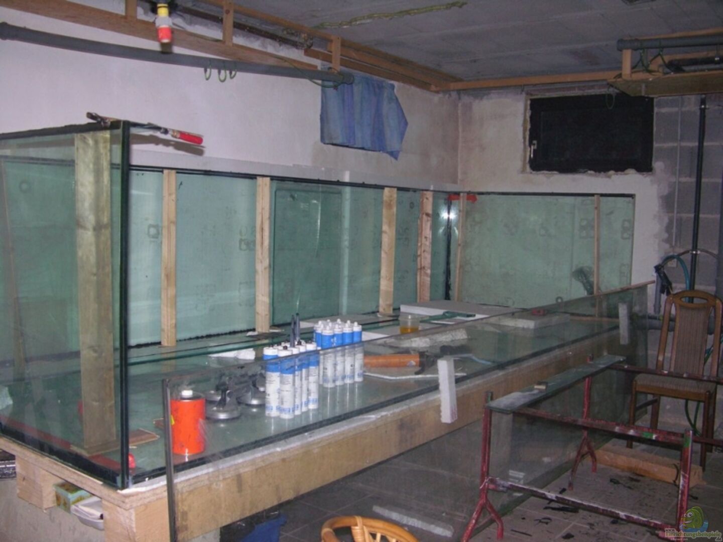 Durchlaufaquarium mit Ablauf ins grosse Becken. Gebraucht gekauft, mit Freunden vom fischliforum abgebaut. Das Kellerfenster (wieder mal) rausgestemmt, in den Keller geschafft und dann mit Ruhe wieder aufgebaut. Die Frontscheibe wurde erst nach fertigstellung der Rückwand und Deckendekoration eingeklebt. Glasstärke 2x12mm VSG, Alle Klebefugen wurden zusätzlich mit 15mm 7cm breiten Glasstreifen verstärkt sodass sich eine 4cm Silikonnakt ergibt, das reine Glasgewicht ist ca 1000kg. Unterbau [...]