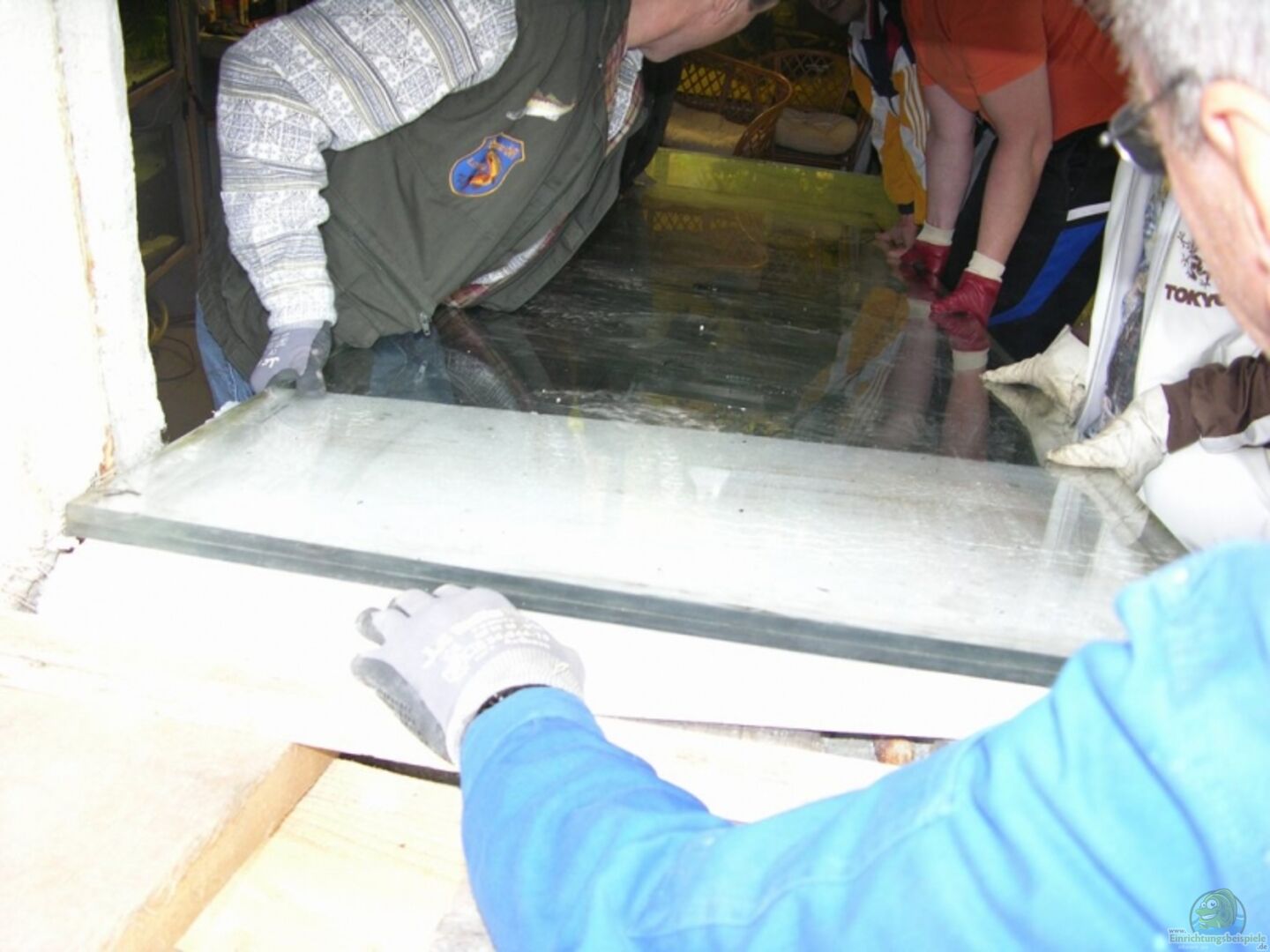 Durchlaufaquarium mit Ablauf ins grosse Becken. Gebraucht gekauft, mit Freunden vom fischliforum abgebaut. Das Kellerfenster (wieder mal) rausgestemmt, in den Keller geschafft und dann mit Ruhe wieder aufgebaut. Die Frontscheibe wurde erst nach fertigstellung der Rückwand und Deckendekoration eingeklebt. Glasstärke 2x12mm VSG, Alle Klebefugen wurden zusätzlich mit 15mm 7cm breiten Glasstreifen verstärkt sodass sich eine 4cm Silikonnakt ergibt, das reine Glasgewicht ist ca 1000kg. Unterbau [...]