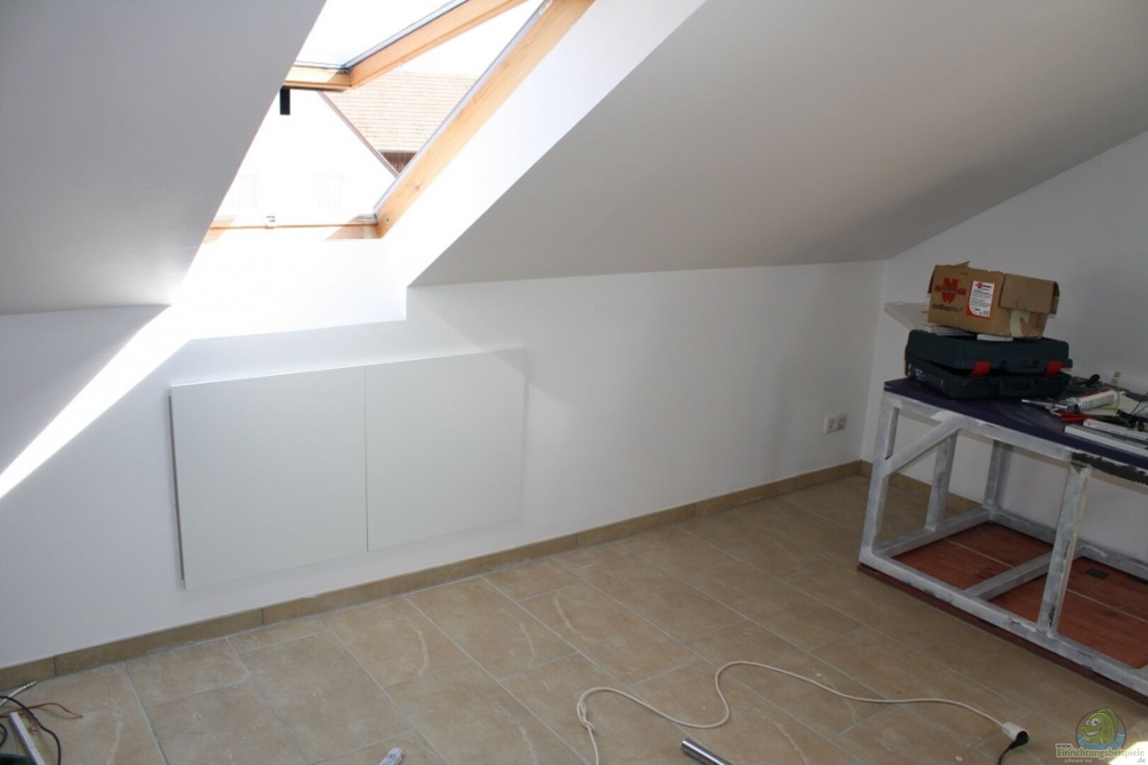 Stahlgestell ist in die Wand einbetoniert. 2 Bohrungen (Ablauf 40mm, Notablauf 40mm). Filterbecken steht in der Dachschräge, zugänglich durch zwei Türen. Gesamtvolumen der Anlage = 1185 Liter An der langen Seite des Beckens wird die Couch stehen (siehe Hauptbild).
