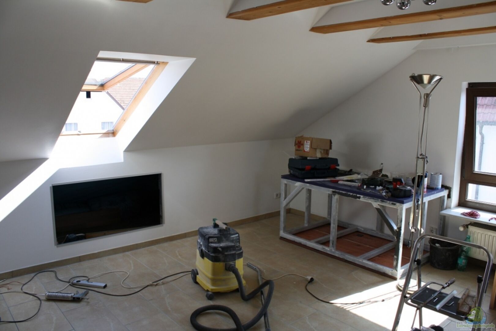 Stahlgestell ist in die Wand einbetoniert. 2 Bohrungen (Ablauf 40mm, Notablauf 40mm). Filterbecken steht in der Dachschräge, zugänglich durch zwei Türen. Gesamtvolumen der Anlage = 1185 Liter An der langen Seite des Beckens wird die Couch stehen (siehe Hauptbild).