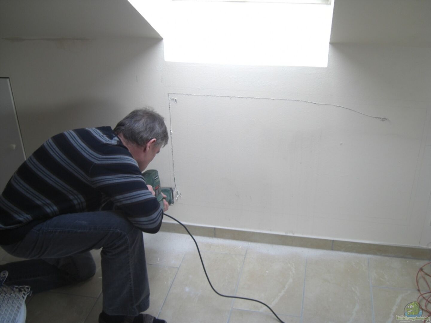 Stahlgestell ist in die Wand einbetoniert. 2 Bohrungen (Ablauf 40mm, Notablauf 40mm). Filterbecken steht in der Dachschräge, zugänglich durch zwei Türen. Gesamtvolumen der Anlage = 1185 Liter An der langen Seite des Beckens wird die Couch stehen (siehe Hauptbild).