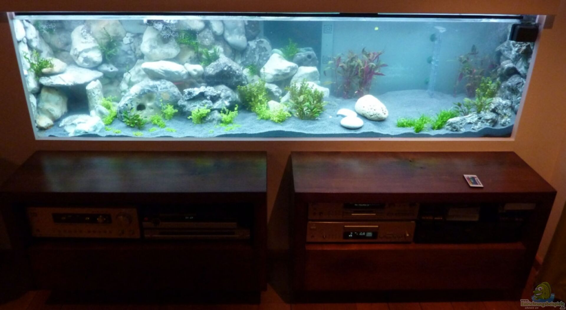 Becken ist in Doppelwand eingesetzt. Vom Wohnzimmer aus kann die darüber hängende Leinwand mit Gasdruckdämpfern hoch geklappt werden um an das Becken zu gelangen. An der linken Seite ist im Becken hinter der Wand ein 3-Kammer-Filter eingeklebt. Dieser ist über eine Abstell-, bzw. Technikkammer zugänglich. Im Kammerfilter sind auch die bodenfluterunterstützenden Heizungen und die CO2 Anlage eingesetzt.
