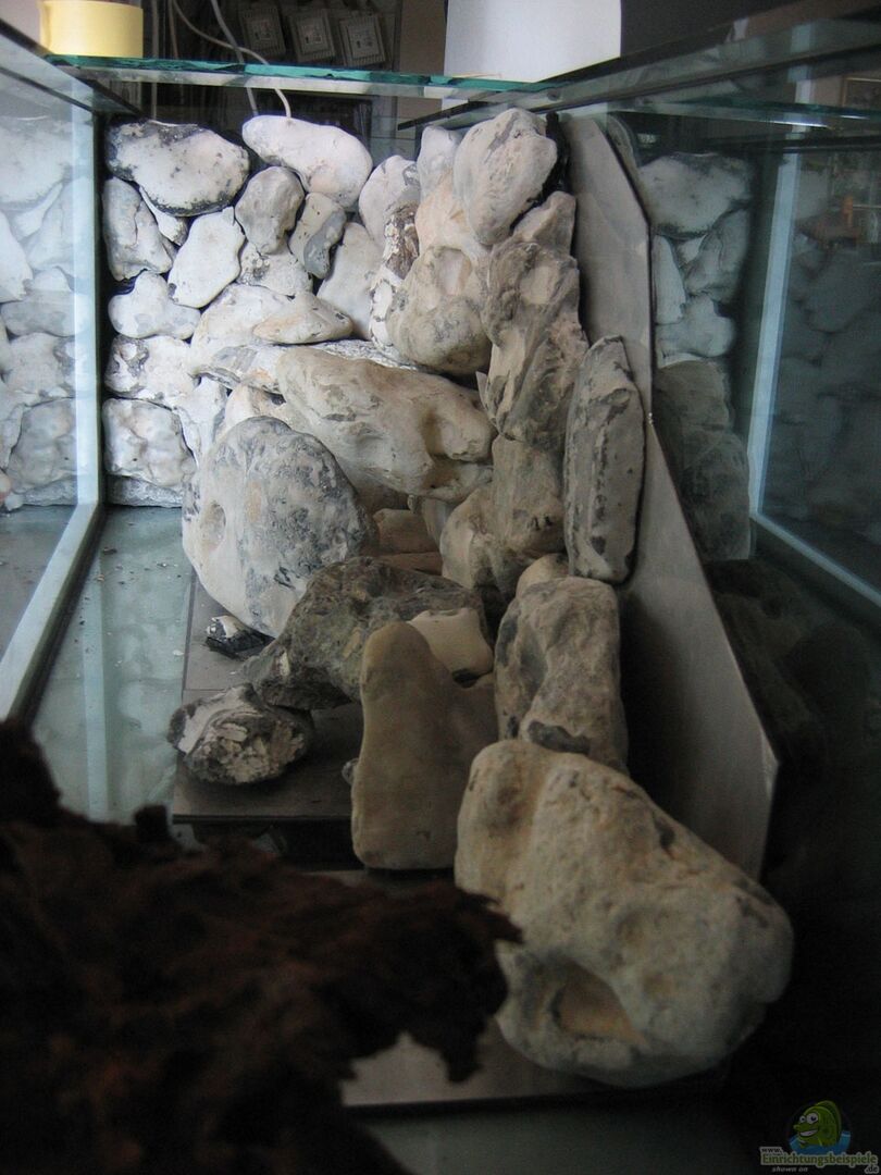 Becken ist in Doppelwand eingesetzt. Vom Wohnzimmer aus kann die darüber hängende Leinwand mit Gasdruckdämpfern hoch geklappt werden um an das Becken zu gelangen. An der linken Seite ist im Becken hinter der Wand ein 3-Kammer-Filter eingeklebt. Dieser ist über eine Abstell-, bzw. Technikkammer zugänglich. Im Kammerfilter sind auch die bodenfluterunterstützenden Heizungen und die CO2 Anlage eingesetzt.