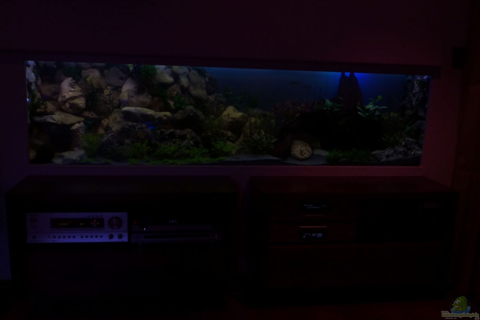 Becken ist in Doppelwand eingesetzt. Vom Wohnzimmer aus kann die darüber hängende Leinwand mit Gasdruckdämpfern hoch geklappt werden um an das Becken zu gelangen. An der linken Seite ist im Becken hinter der Wand ein 3-Kammer-Filter eingeklebt. Dieser ist über eine Abstell-, bzw. Technikkammer zugänglich. Im Kammerfilter sind auch die bodenfluterunterstützenden Heizungen und die CO2 Anlage eingesetzt.