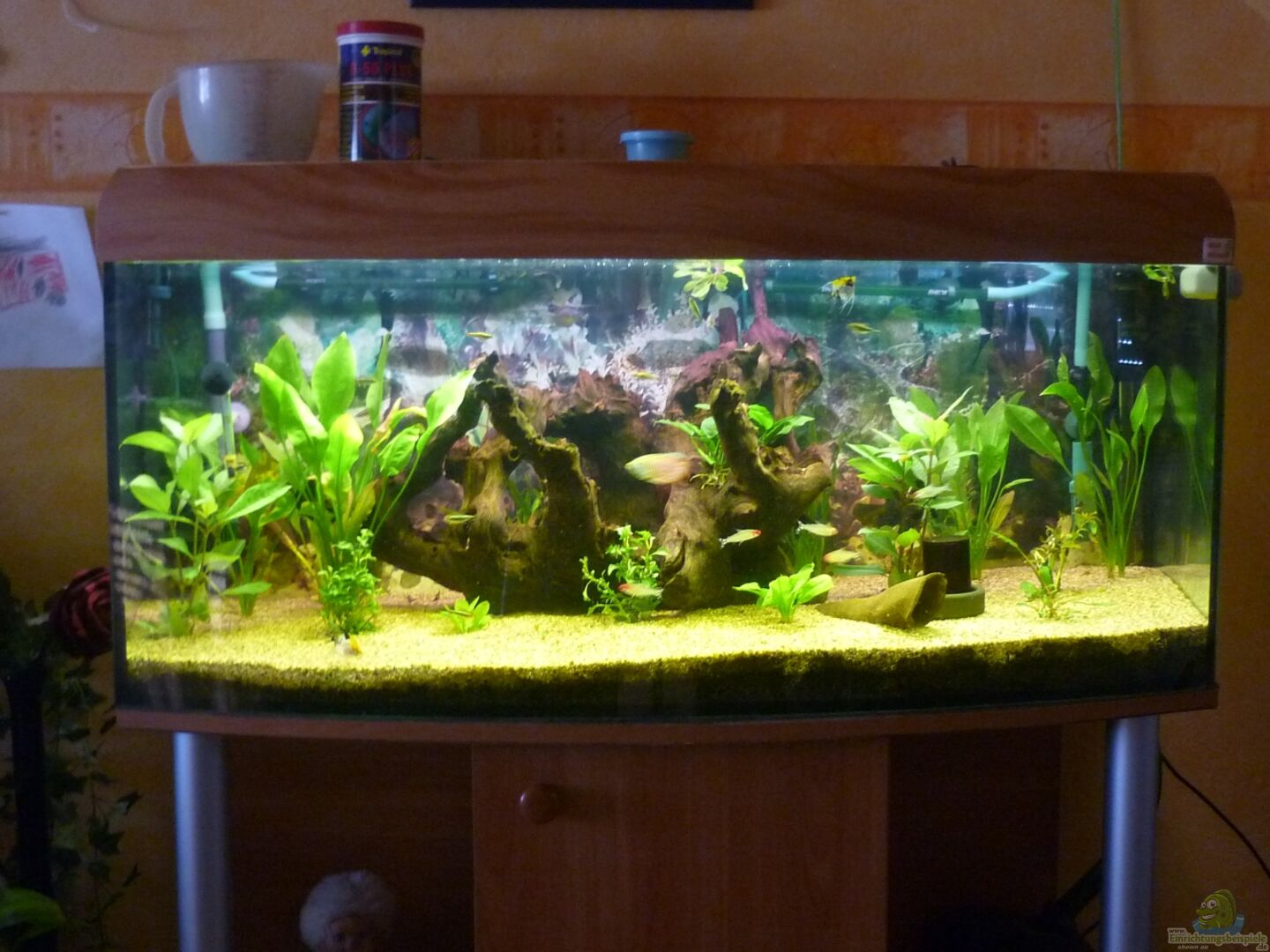 Das Aquarium hat eine gebogene Frontscheibe, die Rückwand ist mit einer Folien Landschaft mit Pflanzen beklebt. Unter dem Becken ist eine Schaumstoffmatte vorhanden, wegen Abkühlung des Beckens. Das Becken steht auf ein Holz Schrank .