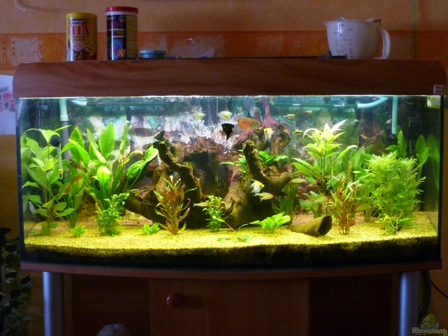 Das Aquarium hat eine gebogene Frontscheibe, die Rückwand ist mit einer Folien Landschaft mit Pflanzen beklebt. Unter dem Becken ist eine Schaumstoffmatte vorhanden, wegen Abkühlung des Beckens. Das Becken steht auf ein Holz Schrank .
