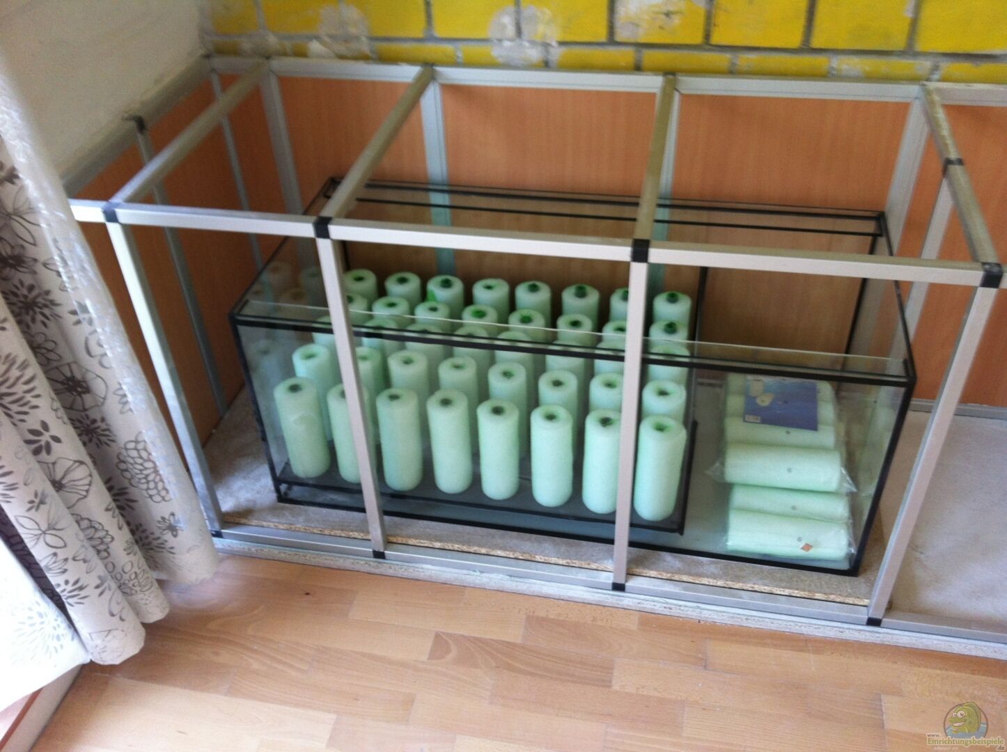 -Die Rückwand wieder von Steinzeit Design. -Breiter ??berlaufschacht mit Kamm und Anschlüssen für Wasserwechsel. -19mm Glas -Glas Abdeckscheiben. -Unterschrank Alugestell von Marine Systems mit Mittelstützen und Scheerwänden, 2 Unterteilungen und Schiebetürensystem.