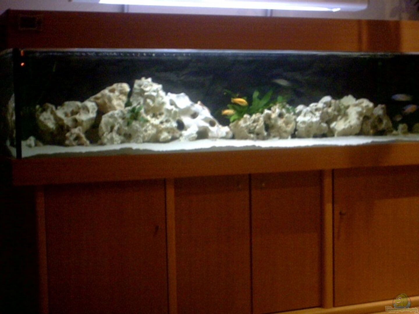 Das Becken steht auf einem vom Tischler angefertigtem Schrank, der aus drei verschiedenen Küchenarbeitsplatten angefertigt wurde.Eine Kiesblende rundet den besonderen Blickfang ab.Ebenso wie die Lampe alles Marke Eigenbau.Ebenso die Blende an der Abdeckung, um das Herausspringen der Fische zu vermeiden so wie unnötigen Wärmeverlust ist es mit Glasplatten abgedeckt.Das Becken ist aus 12mm Glas.