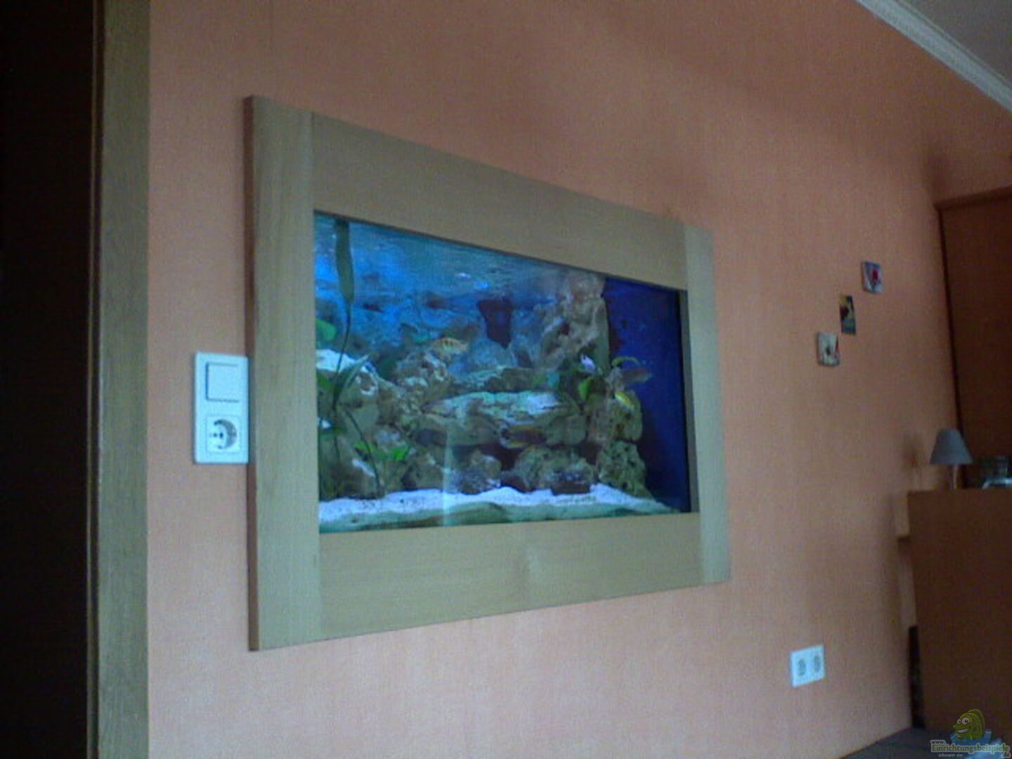 Dieses Becken besitze ich seit 2004, es wurde für mich gebaut, passend für denn Wandschrank im Flur. Von wo aus ich einen Durchbruch ins Wohnzimmer gemacht habe. Das Aquarium besteht aus 12mm Glas, der Boden aus 15mm Glas. Besonders glücklich bin ich über die Grundfläche von 100cmx80cm, was mir erlaubt trotz vieler Versteckmöglichkeiten auch viel Schwimmraum zu bieten.
