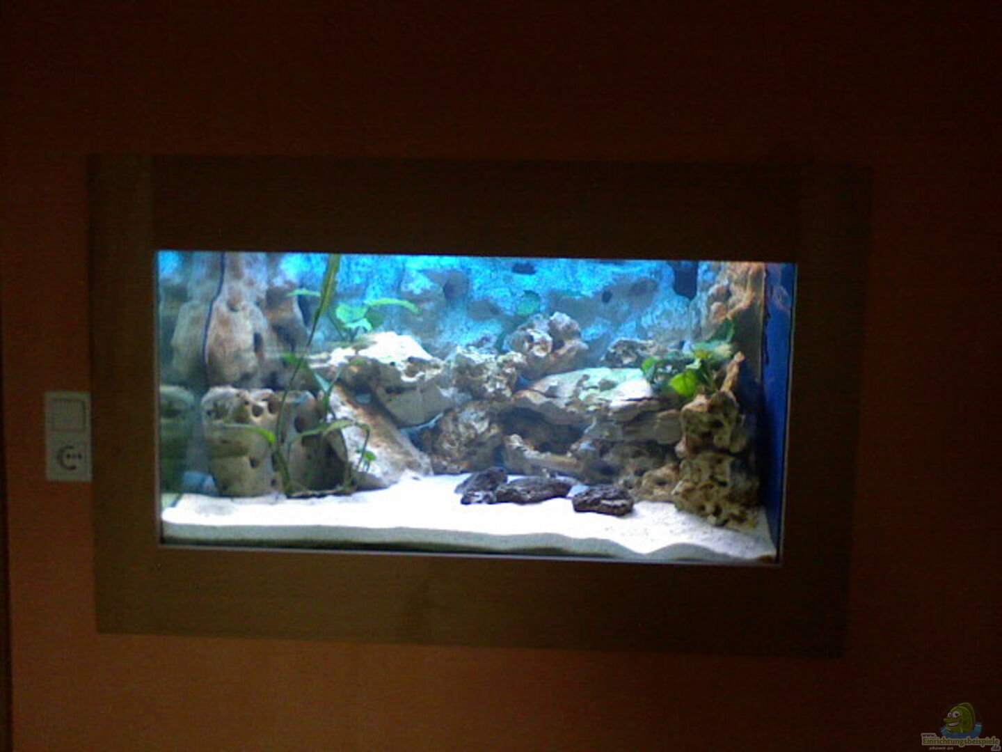 Dieses Becken besitze ich seit 2004, es wurde für mich gebaut, passend für denn Wandschrank im Flur. Von wo aus ich einen Durchbruch ins Wohnzimmer gemacht habe. Das Aquarium besteht aus 12mm Glas, der Boden aus 15mm Glas. Besonders glücklich bin ich über die Grundfläche von 100cmx80cm, was mir erlaubt trotz vieler Versteckmöglichkeiten auch viel Schwimmraum zu bieten.