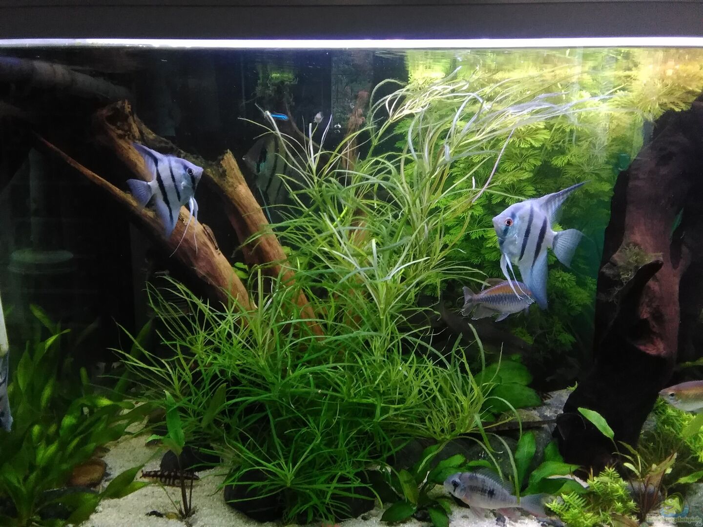 Juwel-Becken, 8 mm Float-Glas, Bodenscheibe 10 cmm Verkleidet von uns mit L-Aluschienen zur besseren Optik auf selbst gezimmertem Tisch, Filter stehen rechts und links