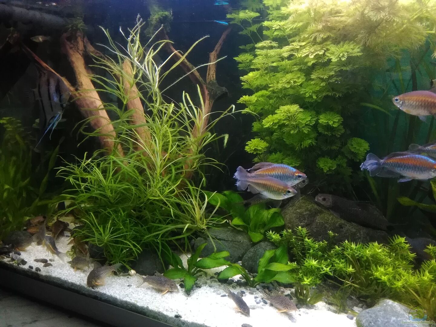 Juwel-Becken, 8 mm Float-Glas, Bodenscheibe 10 cmm Verkleidet von uns mit L-Aluschienen zur besseren Optik auf selbst gezimmertem Tisch, Filter stehen rechts und links