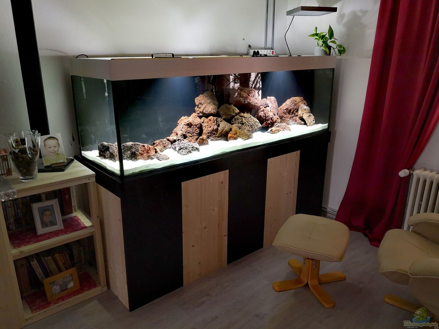 Eigenbau bis aufs Glasbecken. Unterschrank sowie Abdeckung sind selbet gefertigt. Nach Jahren mit fertigen Komplettsystemen habe ich mich dazu entschlossen bis auf Becken alles selber zu bauen. Der Unterschrank besteht aus 70mm Kantholz über Winkel verbunden. AlsVerkleidung dienen Leimholzplatten. Die Abdeckung besteht aus PVC Hartschaumplatten, silikonverklebt. Dessweiteren sind Hohlkammerplatten als Abdeckung verwendet worden. durch die gute Lichtdurchlässigkeit können die LED Fluter drauf [...]
