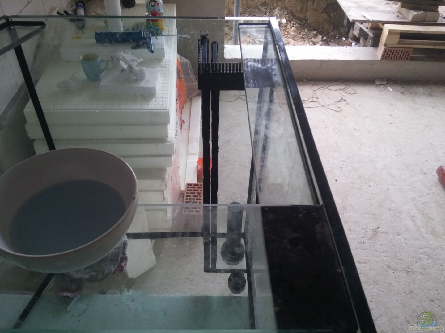 Panorama Becken, 15mm Glasstärke, sto??verklebt mit Sicherheitsnaht, ??berlaufschacht mit 2 Lochbohrungen hinten links, 60mm und 45mm für einen 50mm Ablauf und 32mm Zulauf. Bohrungen habe ich selbst durchgeführt und den ??berlaufschacht selbst eingelebt. Das Becken steht auf einem Stahluntergestell mit einer Breite von 150cm und einer Tiefe von 70cm. Das Gestell ist zur Gewichtsentlastung des doch recht dünnen Betonfu??bodens mit 6 16mm starken Gewindestangen an der Wand befestigt. Die Gewindestangen [...]