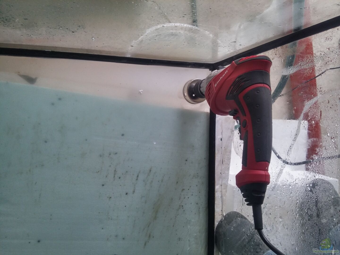 Panorama Becken, 15mm Glasstärke, sto??verklebt mit Sicherheitsnaht, ??berlaufschacht mit 2 Lochbohrungen hinten links, 60mm und 45mm für einen 50mm Ablauf und 32mm Zulauf. Bohrungen habe ich selbst durchgeführt und den ??berlaufschacht selbst eingelebt. Das Becken steht auf einem Stahluntergestell mit einer Breite von 150cm und einer Tiefe von 70cm. Das Gestell ist zur Gewichtsentlastung des doch recht dünnen Betonfu??bodens mit 6 16mm starken Gewindestangen an der Wand befestigt. Die Gewindestangen [...]