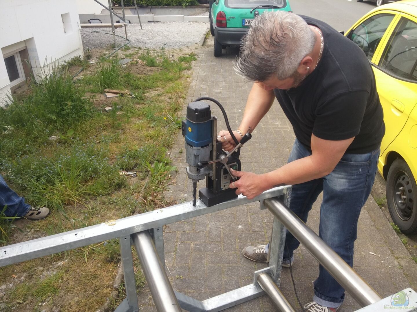 Panorama Becken, 15mm Glasstärke, sto??verklebt mit Sicherheitsnaht, ??berlaufschacht mit 2 Lochbohrungen hinten links, 60mm und 45mm für einen 50mm Ablauf und 32mm Zulauf. Bohrungen habe ich selbst durchgeführt und den ??berlaufschacht selbst eingelebt. Das Becken steht auf einem Stahluntergestell mit einer Breite von 150cm und einer Tiefe von 70cm. Das Gestell ist zur Gewichtsentlastung des doch recht dünnen Betonfu??bodens mit 6 16mm starken Gewindestangen an der Wand befestigt. Die Gewindestangen [...]