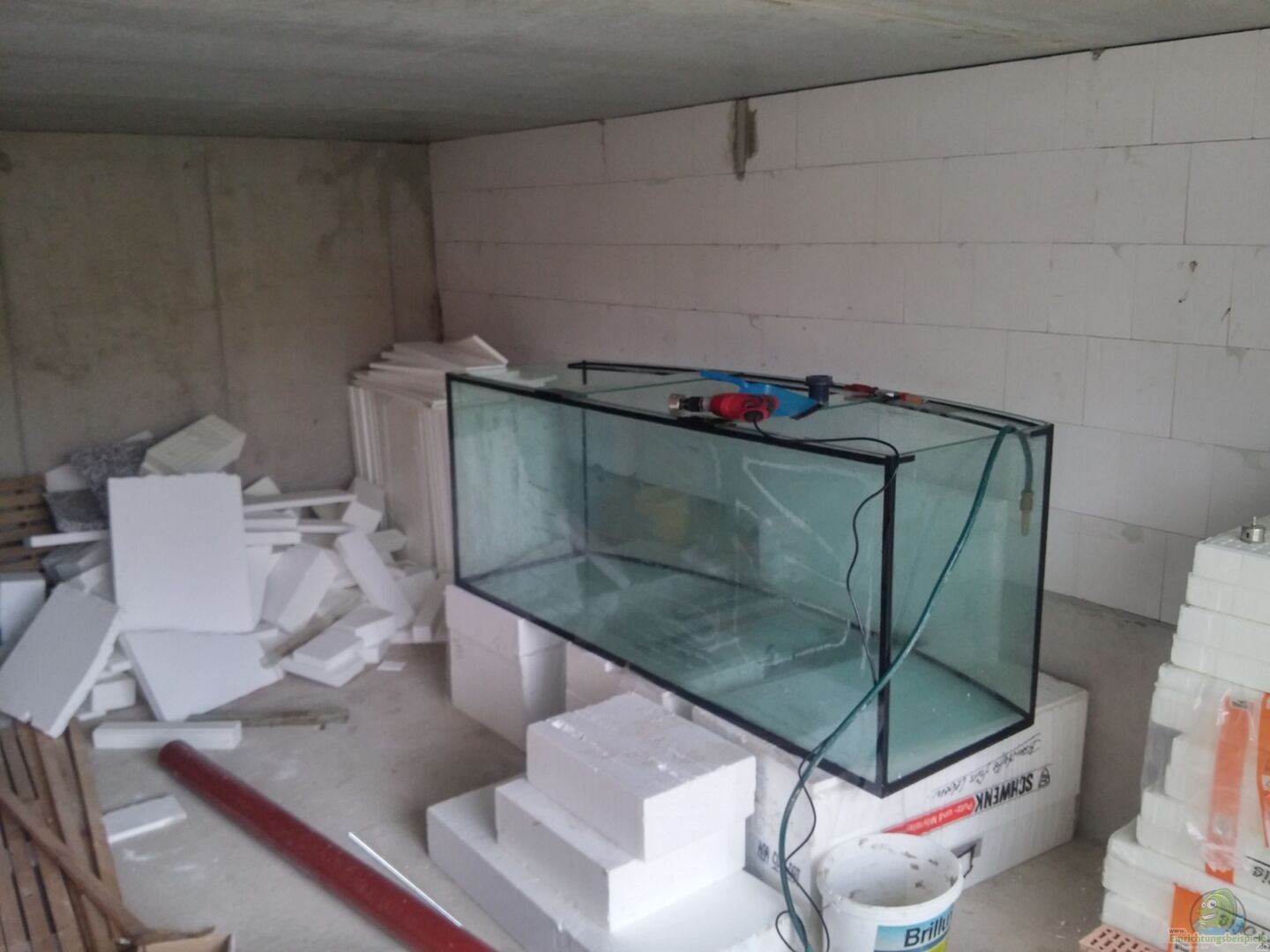 Panorama Becken, 15mm Glasstärke, sto??verklebt mit Sicherheitsnaht, ??berlaufschacht mit 2 Lochbohrungen hinten links, 60mm und 45mm für einen 50mm Ablauf und 32mm Zulauf. Bohrungen habe ich selbst durchgeführt und den ??berlaufschacht selbst eingelebt. Das Becken steht auf einem Stahluntergestell mit einer Breite von 150cm und einer Tiefe von 70cm. Das Gestell ist zur Gewichtsentlastung des doch recht dünnen Betonfu??bodens mit 6 16mm starken Gewindestangen an der Wand befestigt. Die Gewindestangen [...]