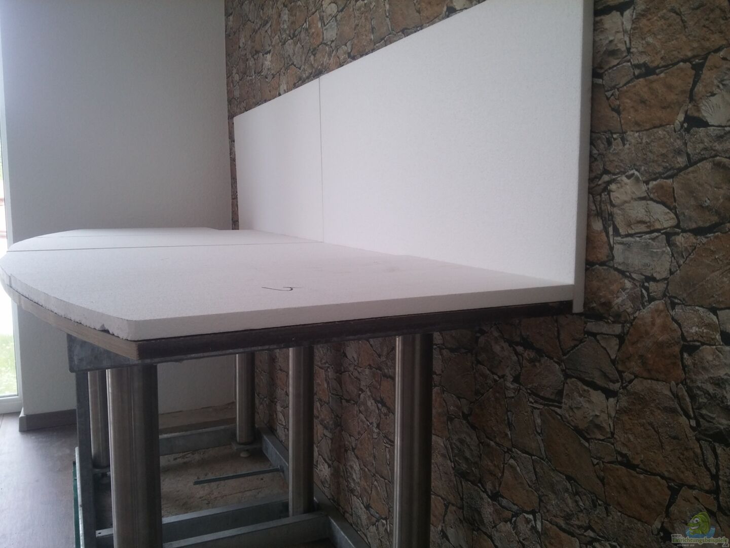 Panorama Becken, 15mm Glasstärke, sto??verklebt mit Sicherheitsnaht, ??berlaufschacht mit 2 Lochbohrungen hinten links, 60mm und 45mm für einen 50mm Ablauf und 32mm Zulauf. Bohrungen habe ich selbst durchgeführt und den ??berlaufschacht selbst eingelebt. Das Becken steht auf einem Stahluntergestell mit einer Breite von 150cm und einer Tiefe von 70cm. Das Gestell ist zur Gewichtsentlastung des doch recht dünnen Betonfu??bodens mit 6 16mm starken Gewindestangen an der Wand befestigt. Die Gewindestangen [...]