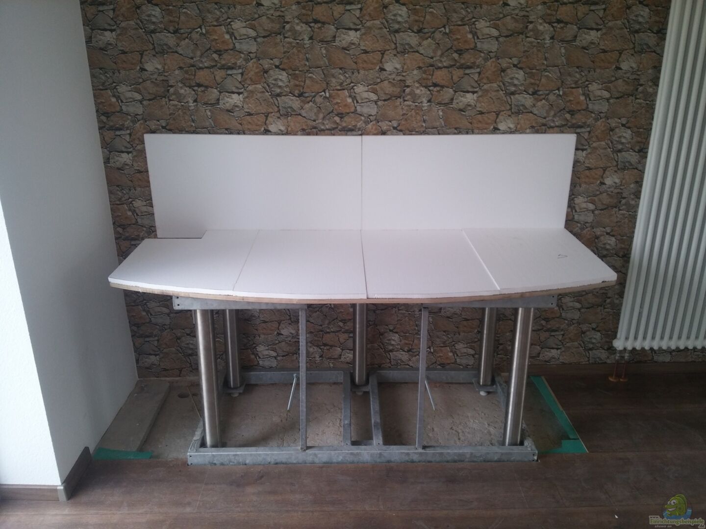 Panorama Becken, 15mm Glasstärke, sto??verklebt mit Sicherheitsnaht, ??berlaufschacht mit 2 Lochbohrungen hinten links, 60mm und 45mm für einen 50mm Ablauf und 32mm Zulauf. Bohrungen habe ich selbst durchgeführt und den ??berlaufschacht selbst eingelebt. Das Becken steht auf einem Stahluntergestell mit einer Breite von 150cm und einer Tiefe von 70cm. Das Gestell ist zur Gewichtsentlastung des doch recht dünnen Betonfu??bodens mit 6 16mm starken Gewindestangen an der Wand befestigt. Die Gewindestangen [...]