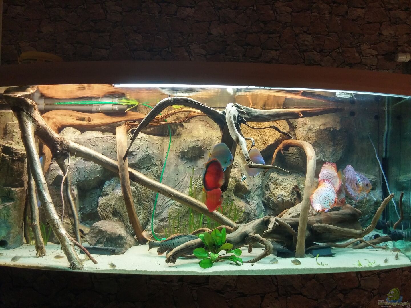 Panorama Becken, 15mm Glasstärke, sto??verklebt mit Sicherheitsnaht, ??berlaufschacht mit 2 Lochbohrungen hinten links, 60mm und 45mm für einen 50mm Ablauf und 32mm Zulauf. Bohrungen habe ich selbst durchgeführt und den ??berlaufschacht selbst eingelebt. Das Becken steht auf einem Stahluntergestell mit einer Breite von 150cm und einer Tiefe von 70cm. Das Gestell ist zur Gewichtsentlastung des doch recht dünnen Betonfu??bodens mit 6 16mm starken Gewindestangen an der Wand befestigt. Die Gewindestangen [...]