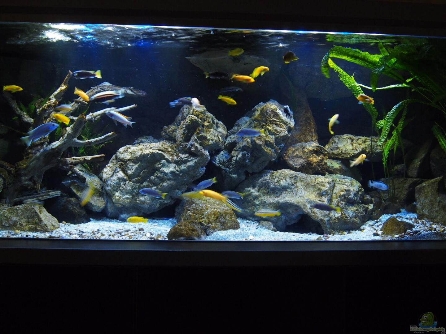 Stossverklebtes Floatglasbecken (12mm), Frontscheibe Wei??glas, Ablaufschacht hinten links (Hersteller: Fa. Diamantaquarium) Unterbau: Porotonmauerwerk mit Auflage aus Küchenarbeitsplatte und einer Auflagenkombination aus 10mm Styropor und einer Aquarienunterlage Die Verkleidung wurde aus melaninharzbeschichteten Möbelplatten gefertigt. Abdeckung: Aluminium silber eloxiert