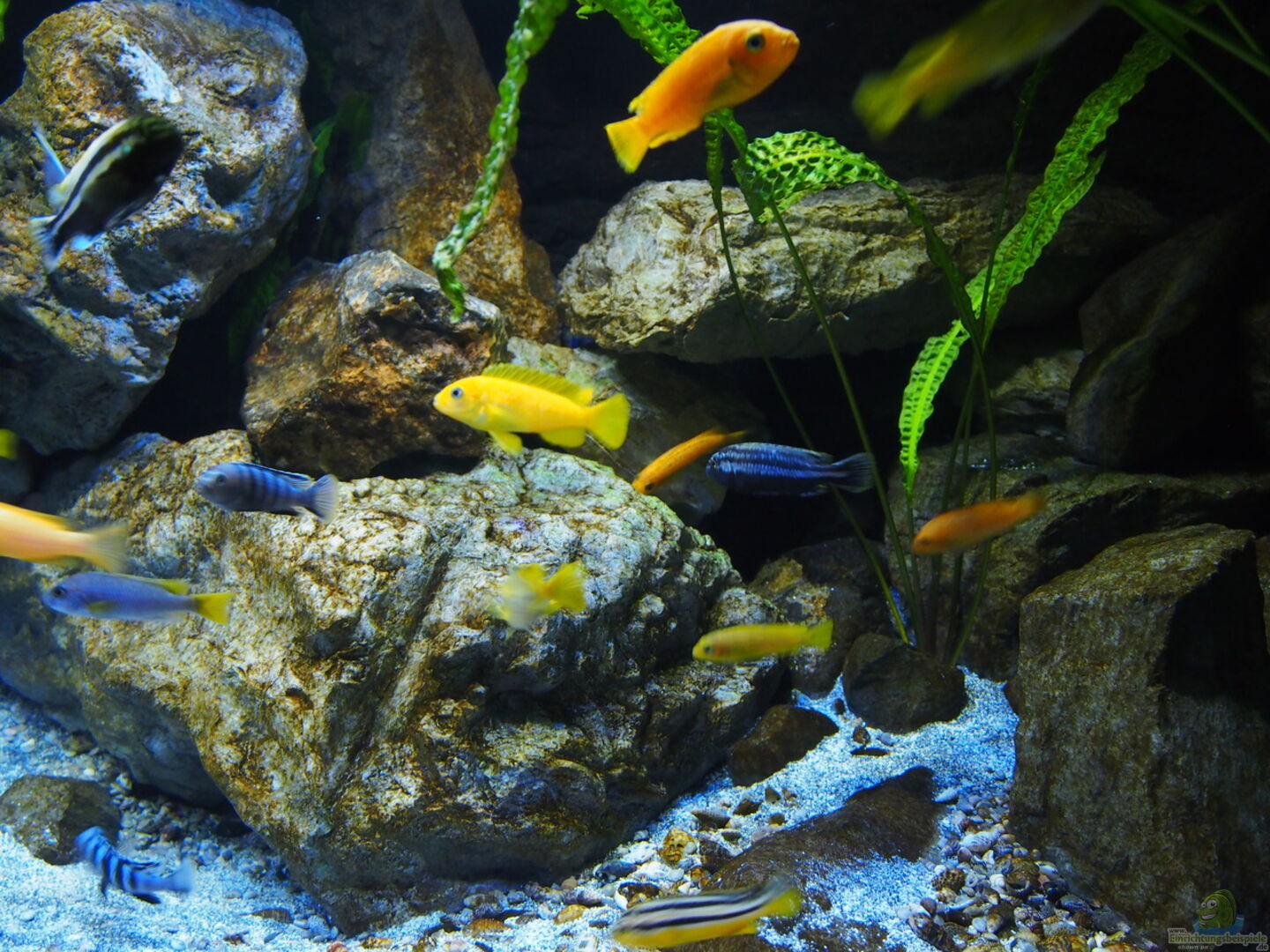Stossverklebtes Floatglasbecken (12mm), Frontscheibe Wei??glas, Ablaufschacht hinten links (Hersteller: Fa. Diamantaquarium) Unterbau: Porotonmauerwerk mit Auflage aus Küchenarbeitsplatte und einer Auflagenkombination aus 10mm Styropor und einer Aquarienunterlage Die Verkleidung wurde aus melaninharzbeschichteten Möbelplatten gefertigt. Abdeckung: Aluminium silber eloxiert