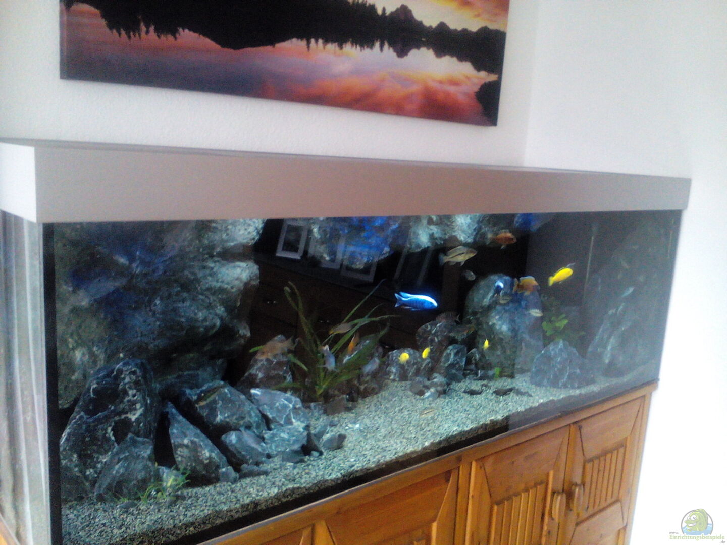 Das Becken mit den Ma??en 195??60 ??60 wurde von Aquariumbau Ennigerloh anfertigt. Ebenfalls die Abdeckung ohne Technik. Die Beleuchtung wurde von mir selbst in Eigenbau eingebaut. Auf die Rückseite des Beckens wurde eine schwarze D-c fix Folie in Mattschwarz geklebt. Rückwandmodule und Steine sind Eigenbau, die teilweise mit Alpengestein gemischt wurden. Gefiltert wird das Becken mit einem Fluval fx 6 Au??enfilter.