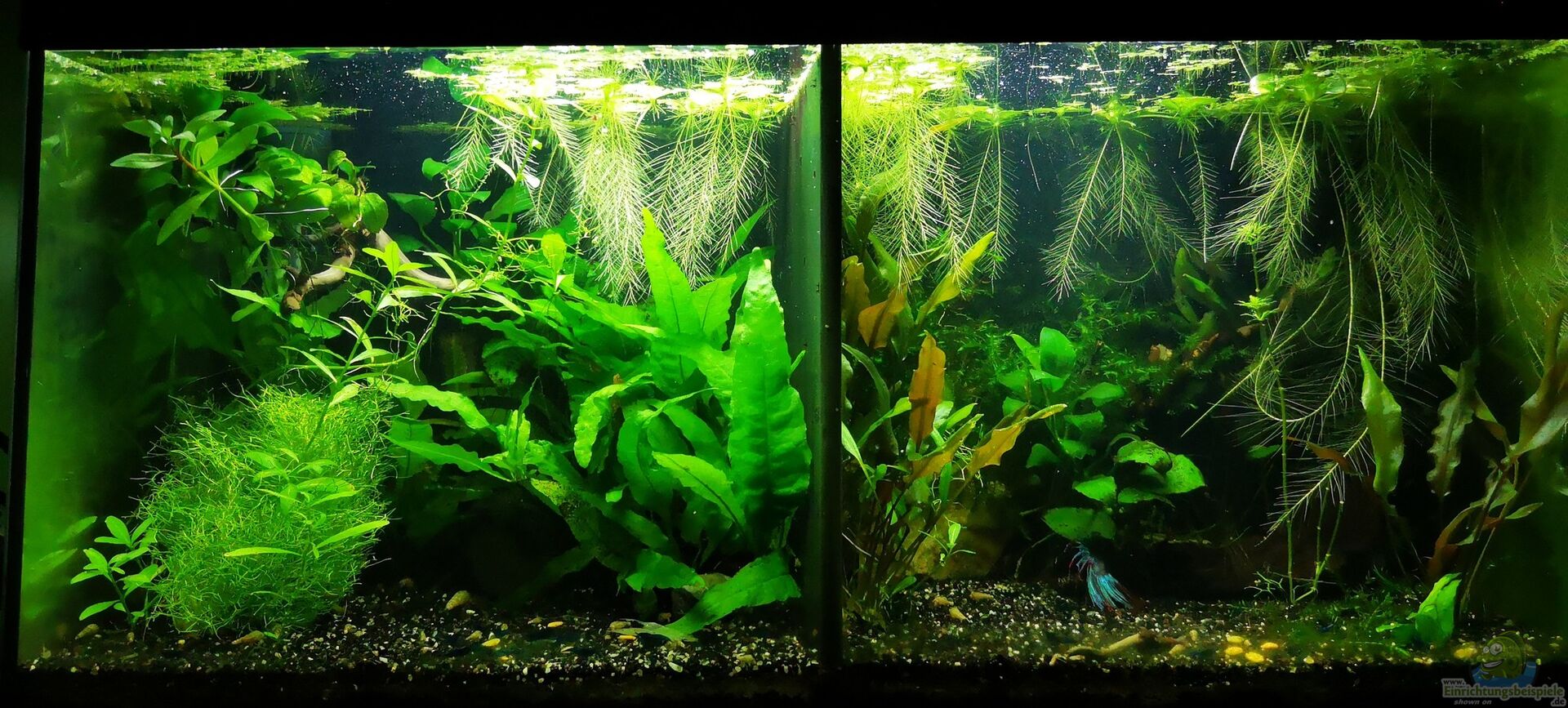 Das Becken wurde mit einer schwarzen Plexiglasscheibe geteilt. In die Scheibe habe ich viele kleine Löcher gebohrt, damit das Wasser besser zirkuliert.