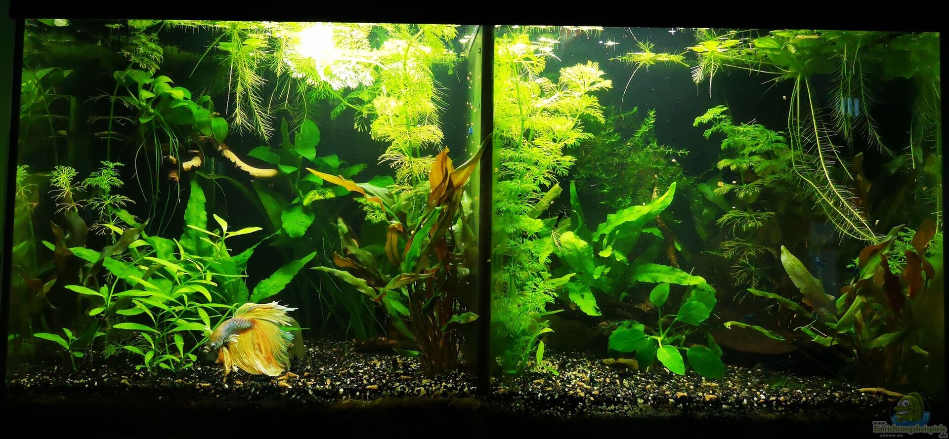 Das Becken wurde mit einer schwarzen Plexiglasscheibe geteilt. In die Scheibe habe ich viele kleine Löcher gebohrt, damit das Wasser besser zirkuliert.