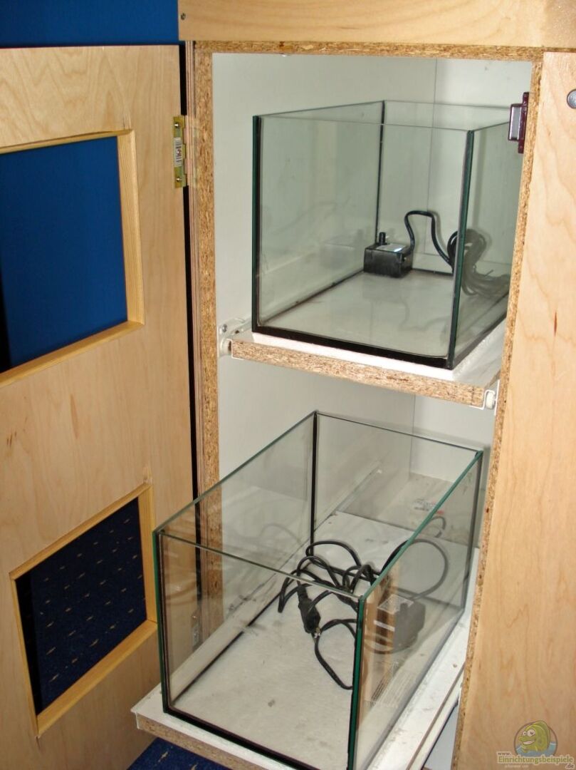 => Becken nur von vorn einsehbar, die anderen seiten sind verkleidet. => Schrank Marke Eigenbau, im rechten Teil des Unterschranksbefinden sich Filter etc., und im linken Teil befinden sich noch 2x12 Liter für Zwerggarnelen (momentan noch leer). => Juwel Rückwand ´Rock´ (von der man nichts mehr sieht)