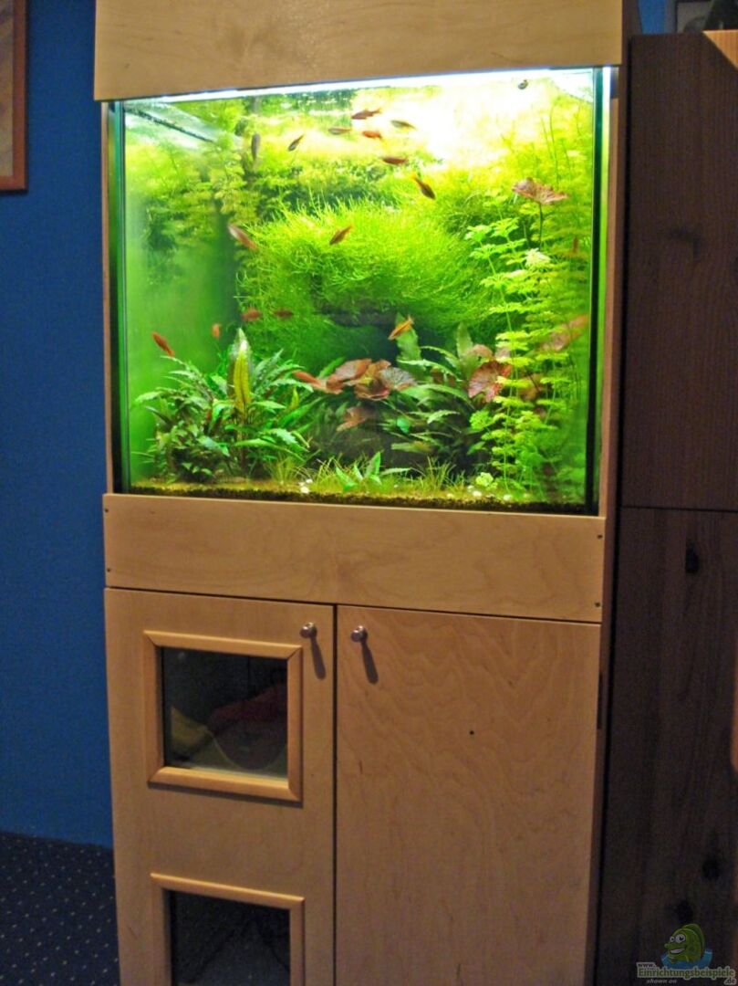 => Becken nur von vorn einsehbar, die anderen seiten sind verkleidet. => Schrank Marke Eigenbau, im rechten Teil des Unterschranksbefinden sich Filter etc., und im linken Teil befinden sich noch 2x12 Liter für Zwerggarnelen (momentan noch leer). => Juwel Rückwand ´Rock´ (von der man nichts mehr sieht)